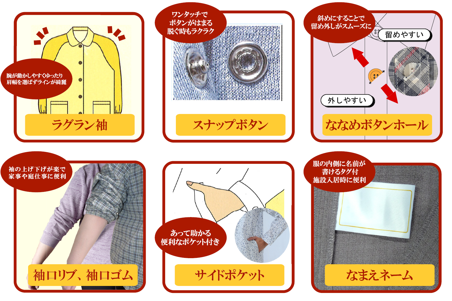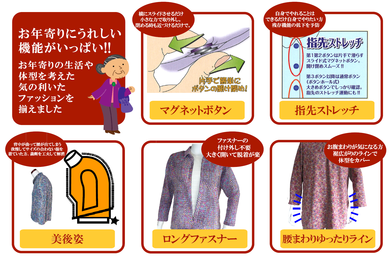 当社の考え方として、年齢、体型、サイズ、身体の機能等に関わり無く「全ての方」が それぞれのライフスタイルに合わせたファッションを楽しめる服を作ることとしております。 機能詳細 ※画像をクリックすると拡大されます。 PDFデータ PDFデータ